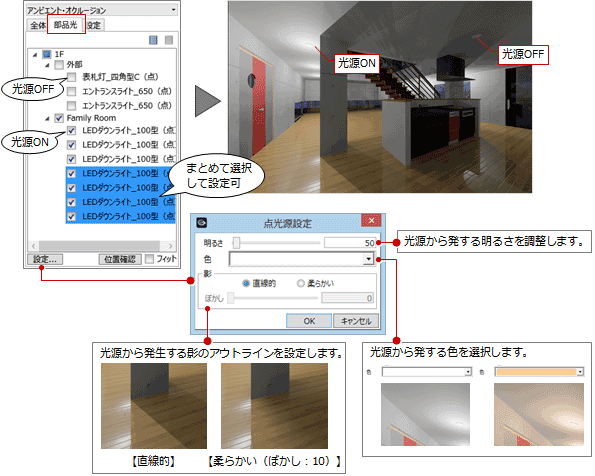 天井の照明器具や玄関灯など、光源を持ったカタログ部品の光を調整するには、「部品光」タブをクリックして設定します。