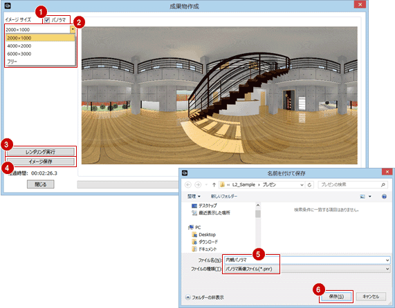 - 「成果物作成」ダイアログの「パノラマ」をONにします。