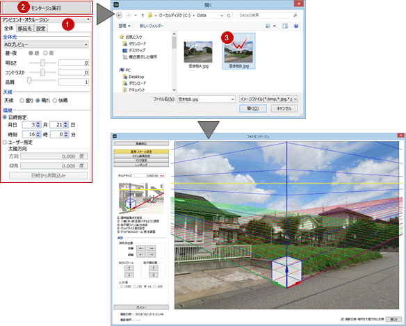「フォトモンタージュ」を選びます。 - レンダリングするモードを選び、太陽方向や背景などの設定を確認します。