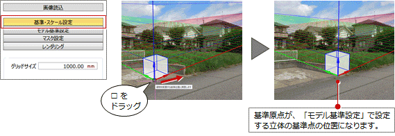 - 「基準・スケール設定」の立方体の基準原点(□)に相当するモデルの位置を、モニタ上で指定します。