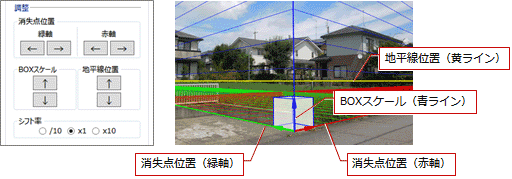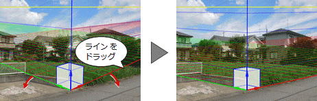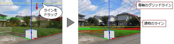 ※ 青軸のグリッドラインが、背景上の建物などのパースラインと同じ傾きで揃うように、黄色ラインを調整します。