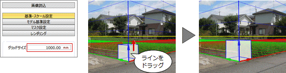 ※ 例えば、基準点から目安となる対象物の天端までが2mであれば、「グリッドサイズ」を「2」に変更して、立方体の青色の天端を対象物の天端に合わせます。