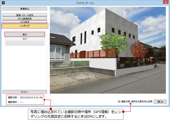 - 現場写真に埋め込まれている撮影日時・場所をレンダリングの光源設定に反映するときは、「撮影日時・場所を太陽方向に反映」をONにします。