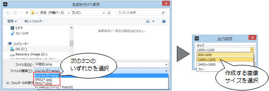 平面や立面を画像ファイルに保存するには、「名前を付けて保存」ダイアログが開いているときに、「ファイルの種類」で「ビットマップ(*.bmp)」「JPEG(*.jpg)」「PNG(*.png)」のいずれかを選びます。
