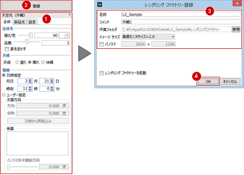 「レンダリングファクトリー登録」を選びます。 - レンダリングするモードを選び、太陽方向や背景などの設定を確認します。