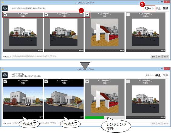 「レンダリングファクトリー起動」を選びます。 - レンダリングを行うデータにチェックを付けて、「スタート」をクリックします。
