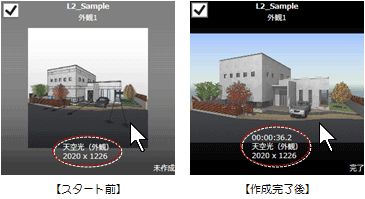 順次レンダリングが行われ、作成が完了したパースには「完了」と表示されます。 - 作成が完了したパースをダブルクリックすると、関連付けられたアプリケーションで画像を確認できます。