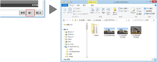 - 画像ファイルは、レンダリングファクトリーに登録したときに指定したファイル名で、「PNG(*.png)」として作業フォルダ内に保存されます。同じファイル名を指定した場合は、ファイル名の後ろに連番が付きます(例:「L2_Sample(1).png」)。
