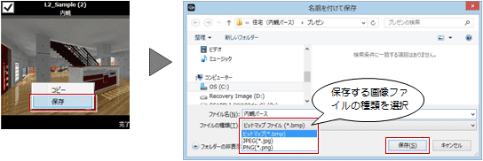 PNGファイル以外の形式に保存したいときは、レンダリングファクトリーの作成完了したデータ上で右クリックして「保存」を選ぶと、「ビットマップ(*.bmp)」「JPEG(*.jpg)」にも保存できます。
