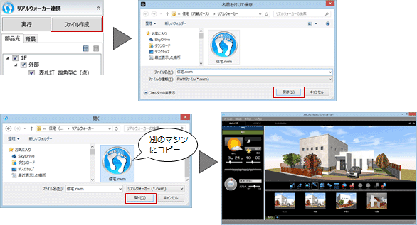 GLOOBEのウォークスルーデータを別のマシンにインストールされているリアルウォーカーで使用するには、「ファイル作成」でウォークスルーデータをファイル(.rwm)に保存し、そのファイルを別のマシンのリアルウォーカーで開きます。