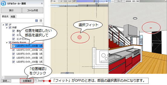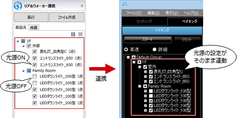 リアルウォーカーで点灯/消灯を切り替えたい照明は、あらかじめGLOOBEで部品光源をONにしておくと、リアルウォーカーにそのまま設定が連動し、ベイク処理後に照明の切り替えが可能になります。