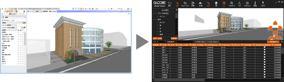 無償のビューワーアプリ「GLOOBE Model Viewer」に読み込んで、建物の3D形状やオブジェクトのプロパティなどを確認できます。