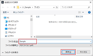 - 作成されるファイルは、開いているモデルファイル(.GLM/.GLCM)と同じ名称のフォルダの「プレゼン」フォルダに保存されます。保存先のフォルダは、「名前を付けて保存」ダイアログで変更できます。
