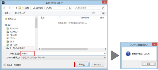 - 作成されるファイルは、開いているモデルファイル(.GLM)と同じ名称のフォルダの「プレゼン」フォルダに保存されます。保存先のフォルダは、「名前を付けて保存」ダイアログで変更できます。