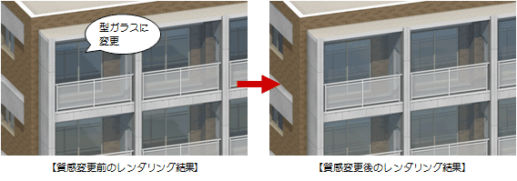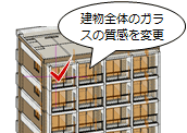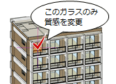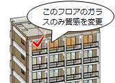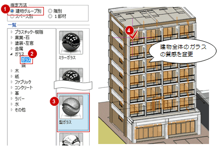 | 建物グループ別 | 建物グループ内の同じオブジェクトを一括変更します。 ※ 平面ビューで質感を変更すると「階別」になります。 |