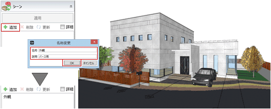 外観、内観、鳥瞰など、1つのプロジェクトデータで見せたいシーンやレンダリングしたいシーンを素早く切り替えることができます。