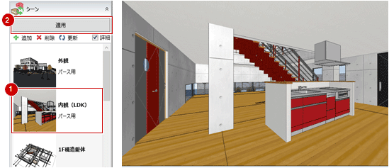 シーンを選んで「適用」をクリックすると、登録した表示状態と視点が呼び出されます。