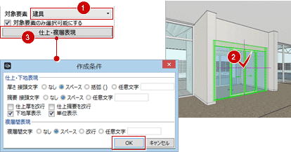 「対象要素のみ選択可能にする」をONにしておくと、対象要素のみがハイライト表示されて選びやすくなります。 - 「仕上・複層表現」をクリックし、引出線の表現を設定して、「OK」をクリックします。