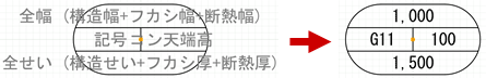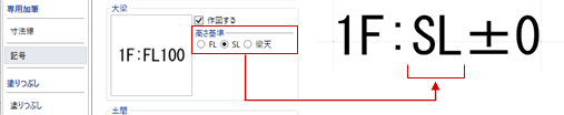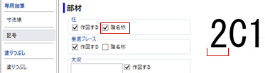 - 「記号」の「階名称」をONにした場合は、階名称から末尾の「F」「階」を除いて付けられます。