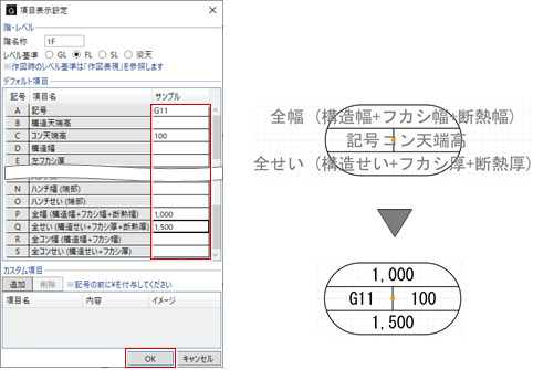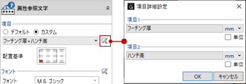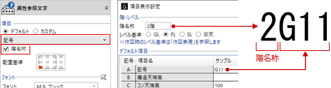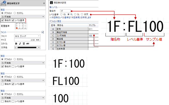 - 「階名称」「レベル基準」のプロパティ項目がある属性参照文字を配置した場合は、項目表示設定の「階・レベル」の内容が連動してサンプル表示されます。