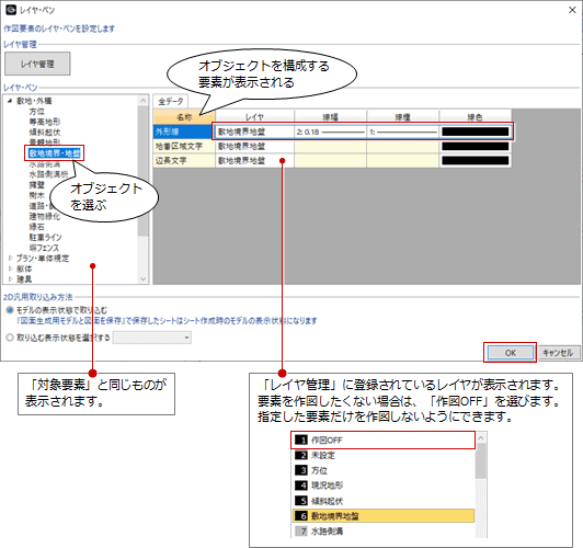 オブジェクトを構成する要素に対して、格納するレイヤ、線種、線色を設定します。
