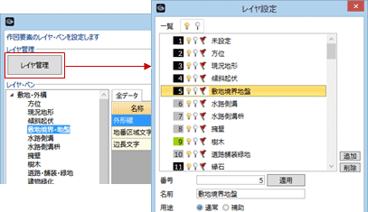 - 図面で使用するレイヤの追加、削除は、「レイヤ管理」で行います。