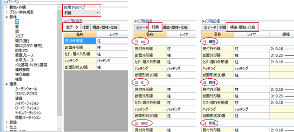 - スペース、柱、壁などは、タイプ別にレイヤ、線種、線色を設定することができます。使用する設定は「採用するタイプ」で選択します。