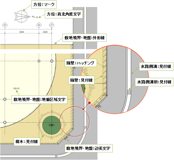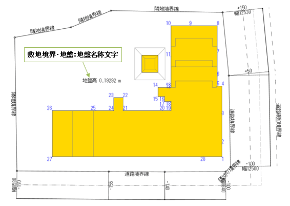 | 敷地境界・地盤 | 外形線 | 地番区域文字 | 辺長文字 | 地盤名称文字 |