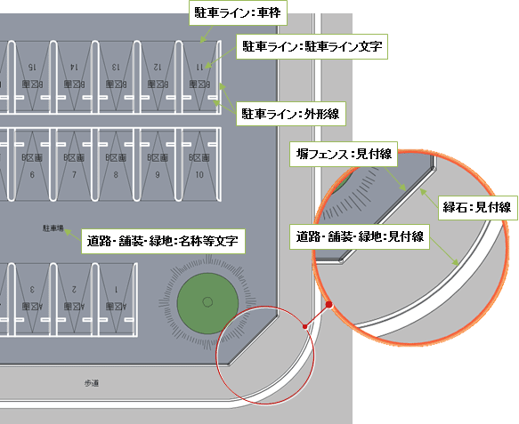| 道路・舗装・緑地 | 見付線 | 名称等文字 | ||