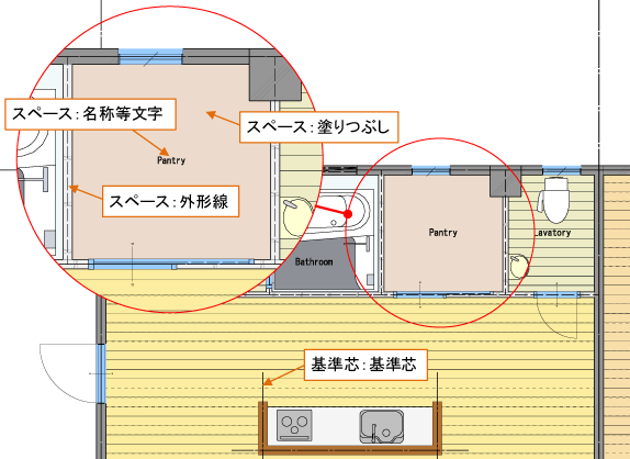 | スペース | 外形線 | 名称等文字 | 塗りつぶし | |
