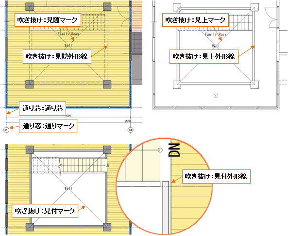 | 吹き抜け | 見付外形線 | 見付マーク | 見隠外形線 | 見隠マーク |