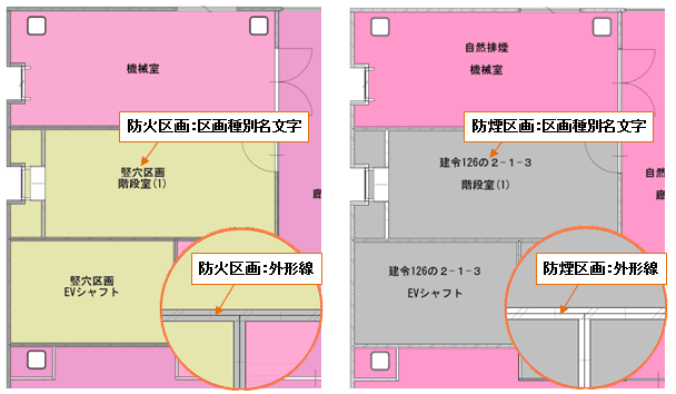 | 防火区画 | 外形線 | 区画種別名文字 | ||