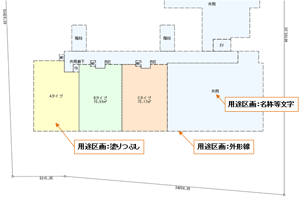 | 用途区画 | 外形線 | 名称等文字 | 塗りつぶし | |