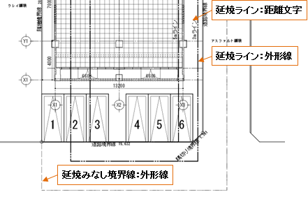 | 延焼ライン | 外形線 | 距離文字 | ||