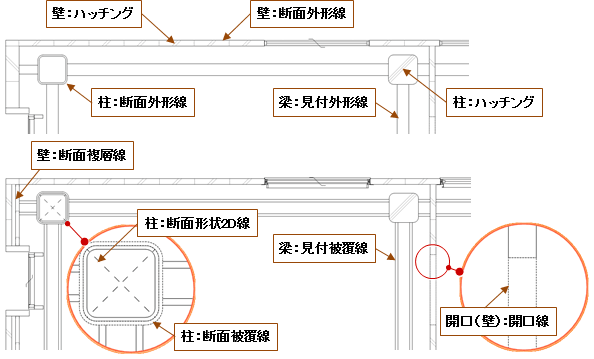 | 柱 | 見付外形線 | 断面外形線 | たれ・隠れ外形線 | ハッチング | 断面形状2D線 |