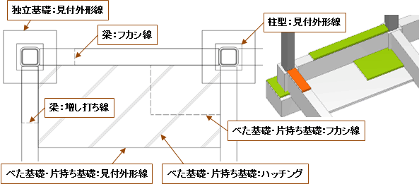 | 基礎梁 | 見付外形線 | 断面外形線 | 隠れ外形線 | 見上外形線 | ハッチング |
