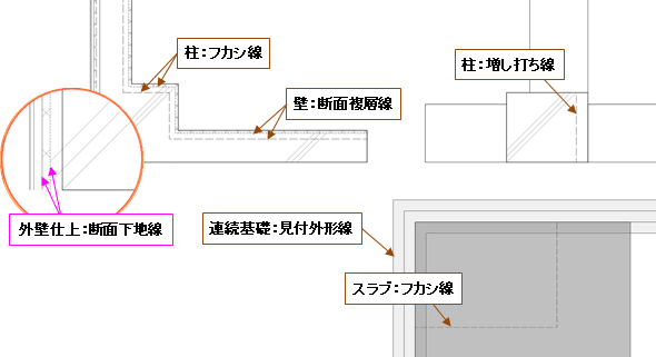 仕上の下地層にフカシや断熱材を設定した場合は、外壁仕上・内壁仕上の「断面下地線」のレイヤ・線幅・線色を使用します。 - 平面詳細図では、梁、連続基礎、独立基礎、柱型の横フカシ・横増し打ち線、および独立基礎の上フカシ線は作図しません。
