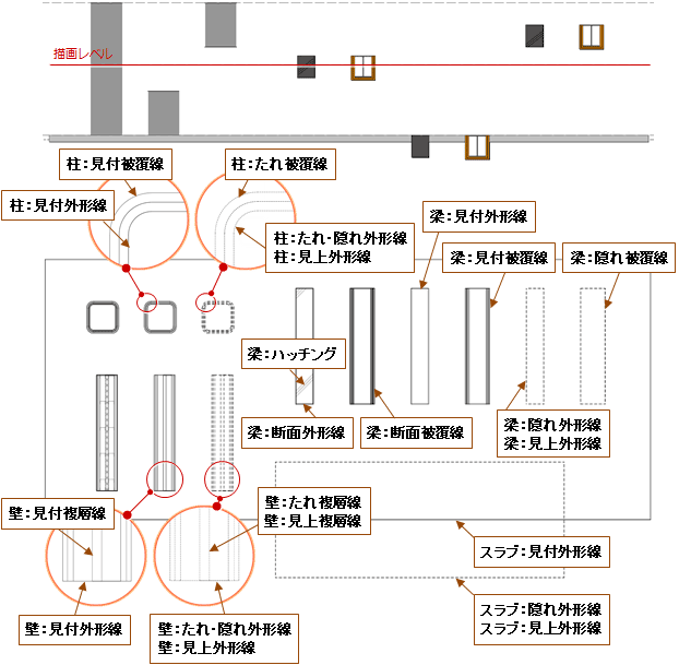 - 「見付」「断面」「隠れ」は、作図表現(階レベル)の描画レベルが影響します。