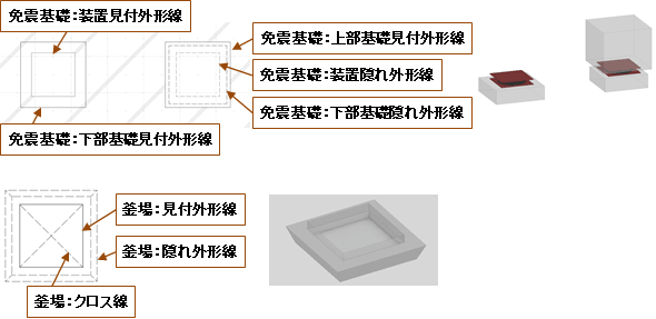 | 免震基礎 | 上部基礎見付外形線 | 下部基礎見付外形線 | 下部基礎隠れ外形線 | 装置見付外形線 | 装置隠れ外形線 |