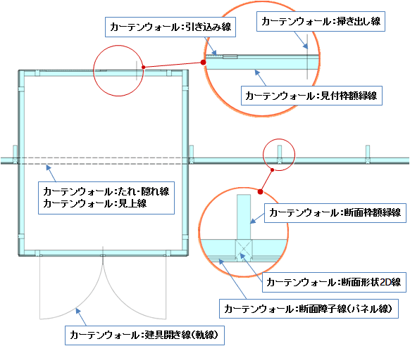 | カーテンウォール | 見付枠額縁線 | 断面障子線(パネル線) | 断面枠額縁線 | 建具開き線(軌線) | 掃き出し線 |