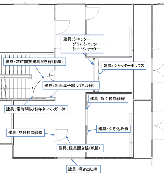 | 建具 | 見付枠額縁線 | 断面障子線(パネル線) | 断面枠額縁線 | 仕上巻込線 | 建具開き線(軌線) |