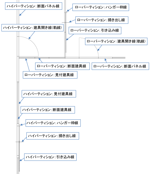 | ローパーティション | 見付建具線 | 断面建具線 | 断面パネル線 | 建具開き線(軌線) | 掃き出し線 |
