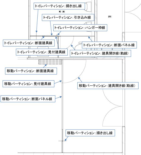 | トイレパーティション | 見付建具線 | 断面建具線 | 断面パネル線 | 建具開き線(軌線) | 掃き出し線 |