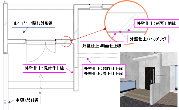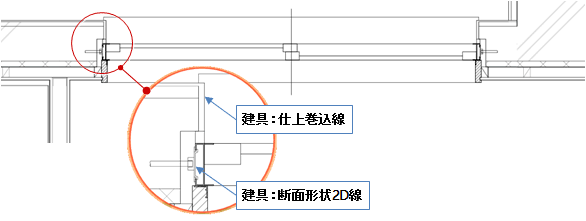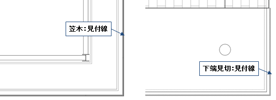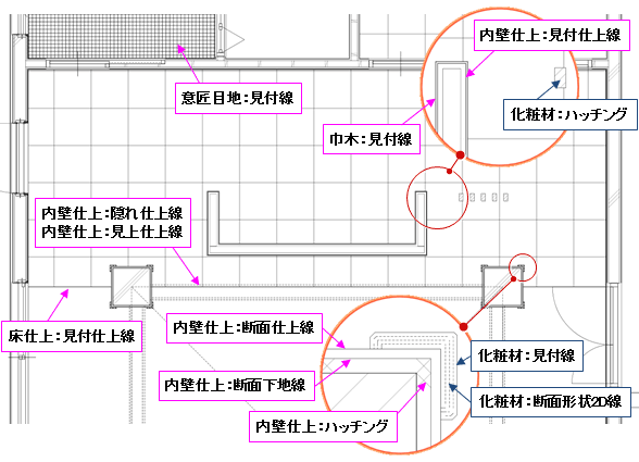 | 化粧材 | 見付線 | ハッチング | 断面形状2D線 | 隠れ線 | 見上線 |