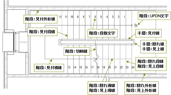 | 階段 | 見付外形線 | 見付段線 | 見付導線 | 隠れ外形線 | 隠れ段線 | 隠れ導線 |