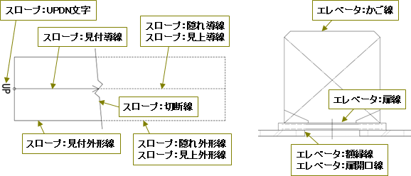 | スロープ | 見付外形線 | 見付導線 | 隠れ外形線 | 隠れ導線 | 見上外形線 | 見上導線 |