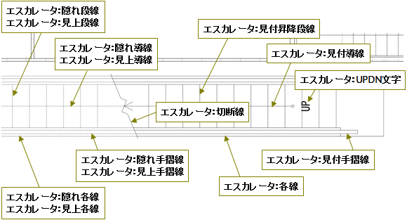 | エスカレータ・動く歩道 | 各線 | 見付手摺線 | 見付導線 | 見付昇降段線 | 隠れ各線 | 隠れ手摺線 |