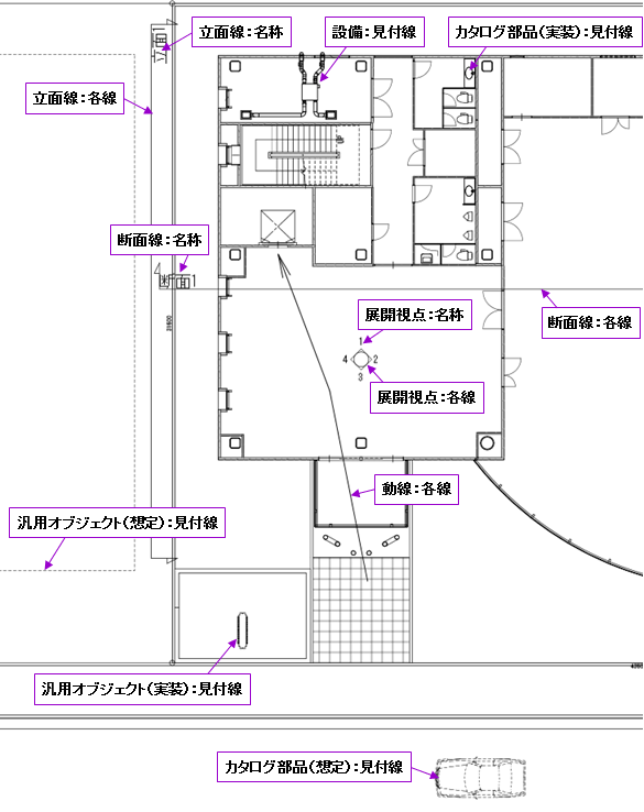 | エレベータ | かご線 | 扉線 | 額縁線 | 扉開口線 | ||