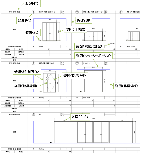 | 建具表 | 表(外枠) | 表(内側) | 姿図(建具絵柄) | 姿図(枠・目地等) |
