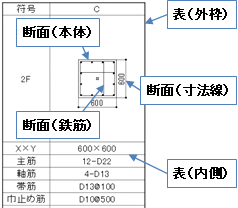 | リスト図 | 表(外枠) | 表(内側) | 断面(本体) | 断面(鉄筋) | 断面(寸法線) |